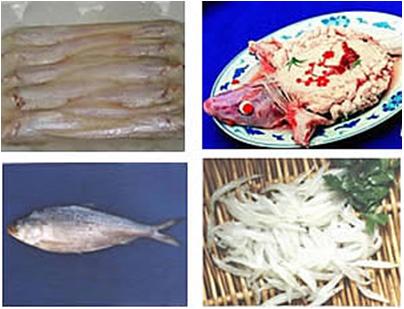 鮰鱼:亦称鮠鱼,俗称白戟。此鱼特点其吻圆突,口腹部,体无鳞,大者长达一米以上。现产量急剧减少,大鮰鱼已不易捕捉。鮰鱼肉肥肉鲜,精炖红烧,均为鱼中名品。其鳔肥厚,可制鱼肚,历来为上等食用鱼类。