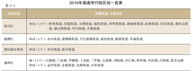 【政区概况】南通市区有崇川区、港闸区、通州区和富民港办事处(与南通市经济技术开发区管委会合署办公),下辖海安县、如东县、启东市、如皋市、海门市。2016年,全市有镇65个、街道37个,村民委员会1302个,居民委员会611个,场圃5个。其中,崇川区有12个街道,港闸区有6个街道,富民港办事处有2个街道,通州区有12个