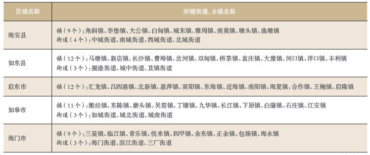 镇、4个街道,海安县有9个镇、4个街道,如东县有12个镇、3个街道,启东市有12个镇,如皋市有11个镇、3个
